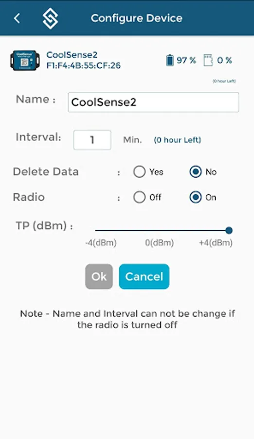 - Configure Device: The App has the ability to configure the CoolSense Bluetooth Enabled Data Logger. The user can set the parameters, such as recording intervals and the temperature and humidity ranges.