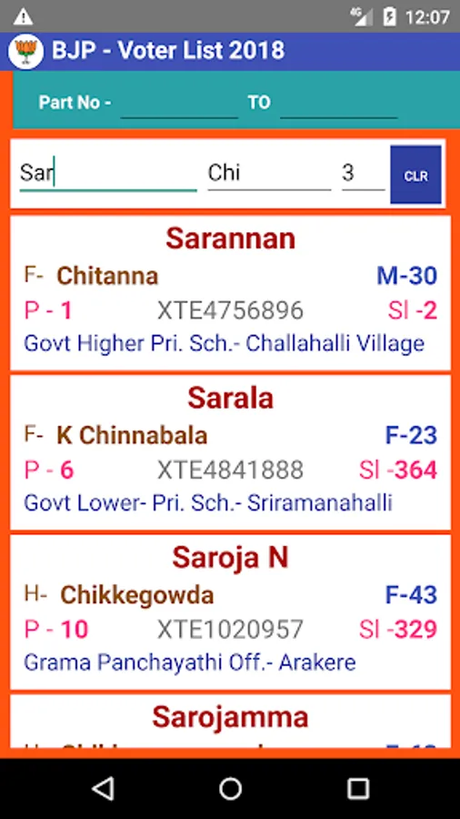First of all this app works in offline mode. Voter list of Yelahanka constituency includes Name, F/H Name, EPIC Card No, age and gender, part / Booth no, Serial No and polling station details. One can find out very easily voter complete details within few seconds.