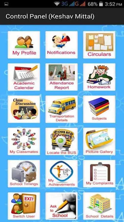 Notifications, Home Work, Circulars, Student Profile, Academic Calendar Attendance Details, Subjects, Student Specific Transport Detail, Bus Location, School Timing, Photo Gallery, Student Achievement and Complaints, Class Discussion, Class Mates and even Parent can Ask their queries from the School.