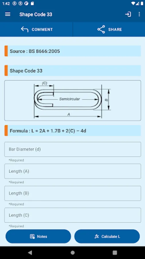 E) Bend shape codes as per BS 8666:2005 : Calculation of total length of rebar for given shape code.