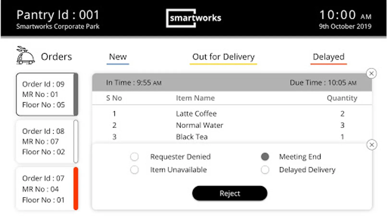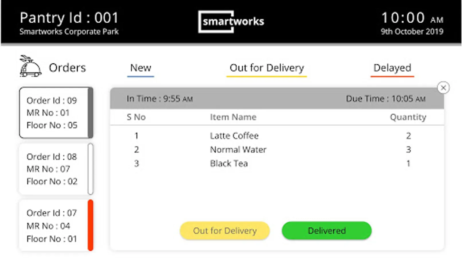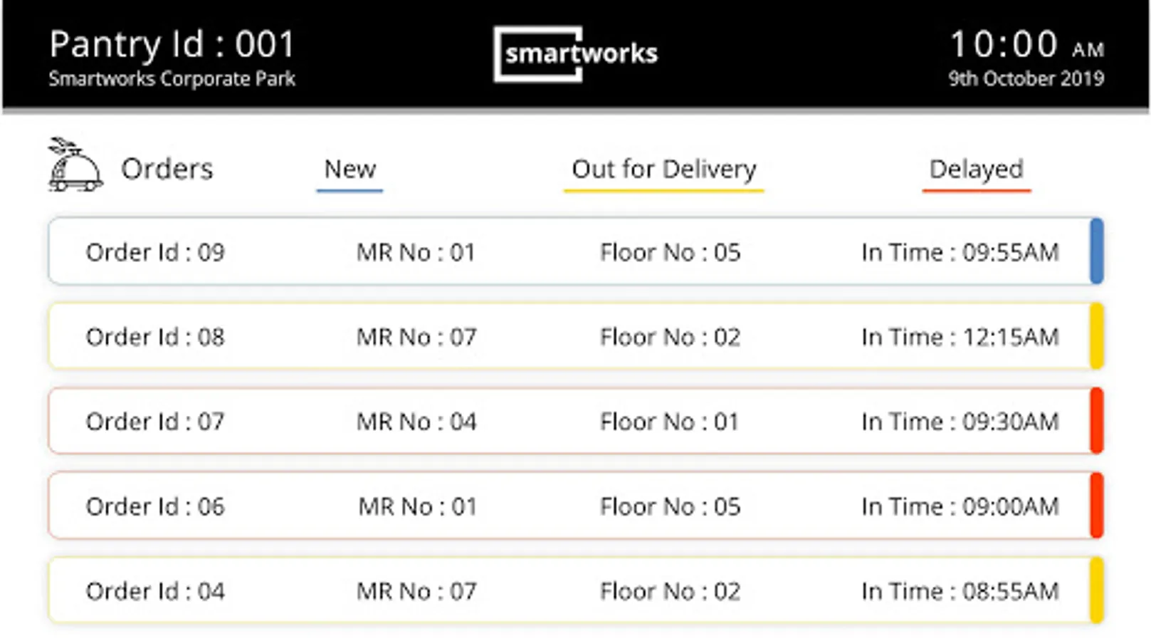 Smatrworks Pantry System provies live tracking of food order received through Food Ordering System installed in smartworks meeting rooms.