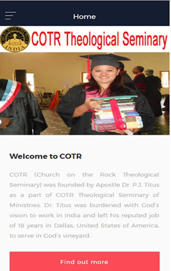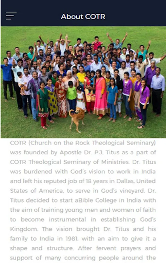 COTR (Church on the Rock Theological Seminary) was founded by Apostle Dr. P.J. Titus as a part of COTR Theological Seminary of Ministries. Dr. Titus was burdened with God’s vision to work in India and left his reputed job of 18 years in Dallas, United States of America, to serve in God’s vineyard. Dr. Titus decided to start aBible College in India with the aim of training young men and women of faith to become instrumental in establishing God’s Kingdom.