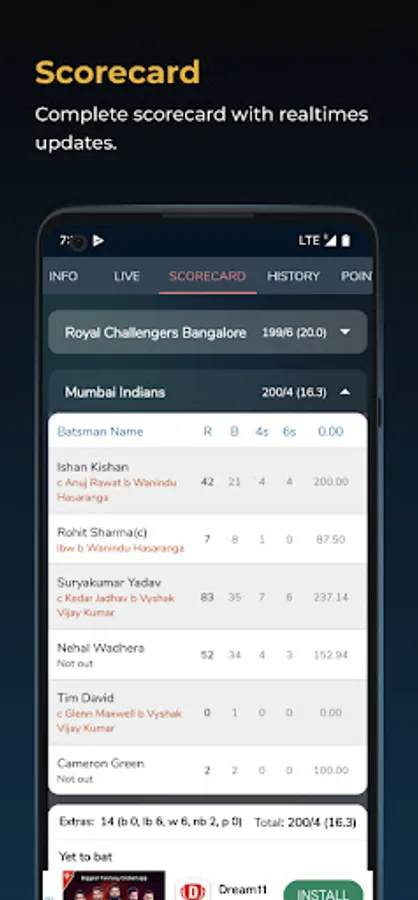 • Match Info with Playing XI, Team Squad, Head to Head, Venue Scoring Patterns and much more.