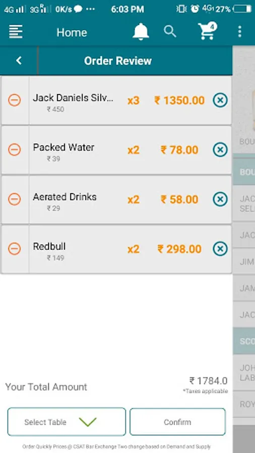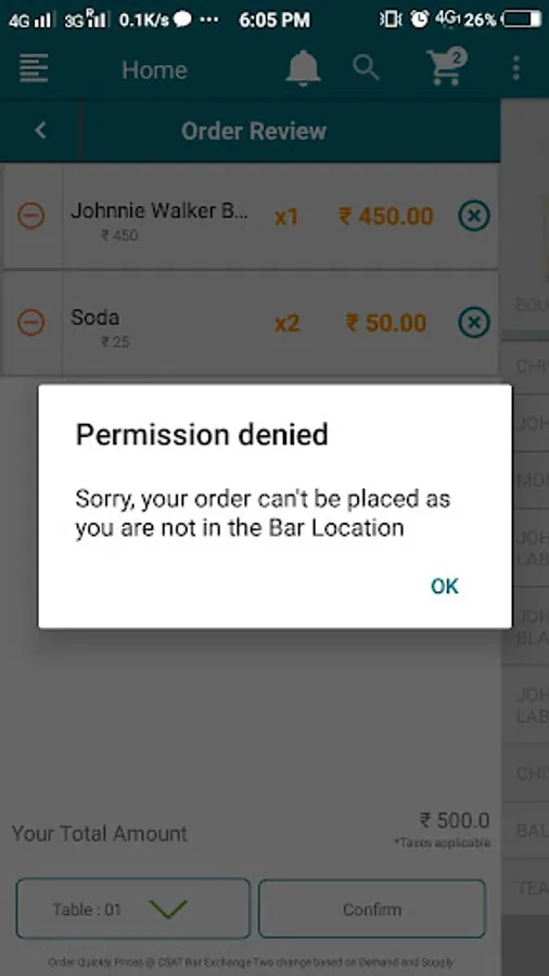 * Here User can select his item and table number and can place order if he is in the Bar
