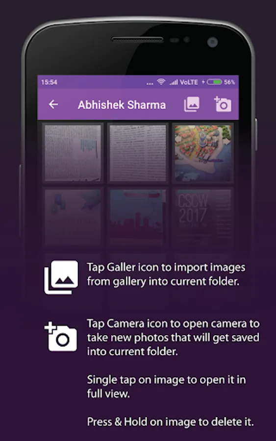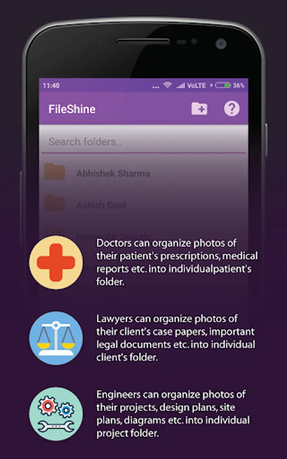* Lawyers can organize photos of their client's case papers, important legal documents etc. into individual client's folder.