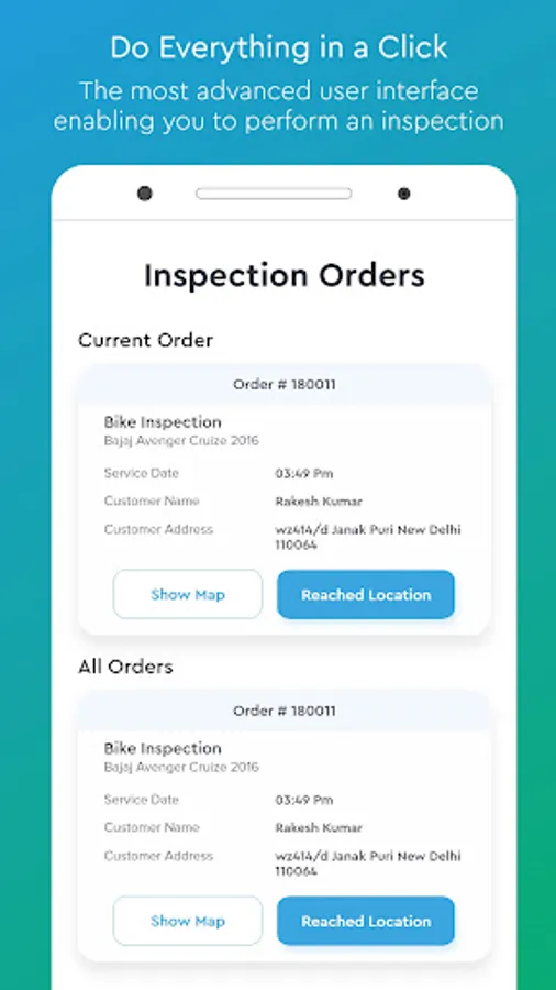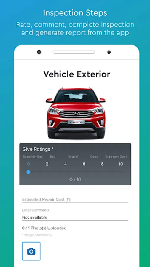 Once inspection is ordered by a customer, the service is delivered by a professional at their doorstep at a convenient time. Before the start of inspection, the technician can call the customer from the application or map the customer location from the inspection panel of the application. On reaching the customer location, the technician starts the inspection process with the press of a button. The inspection is an intuitive process where the technician will have to validate the points in the inspection and rate each part in the automobile on a scale of 10. This is a 121 point check.