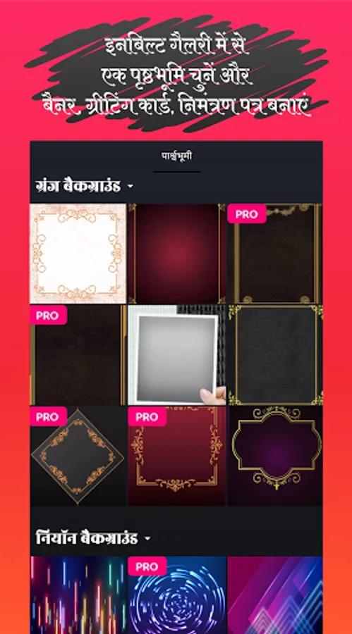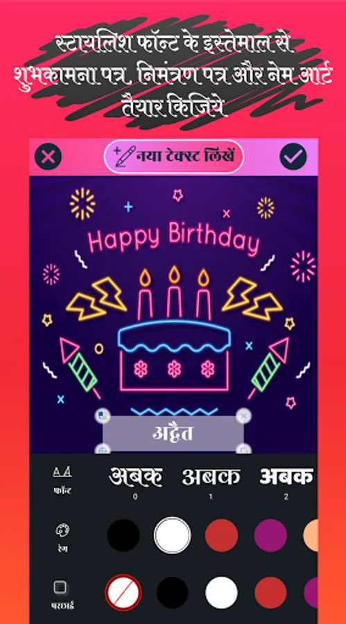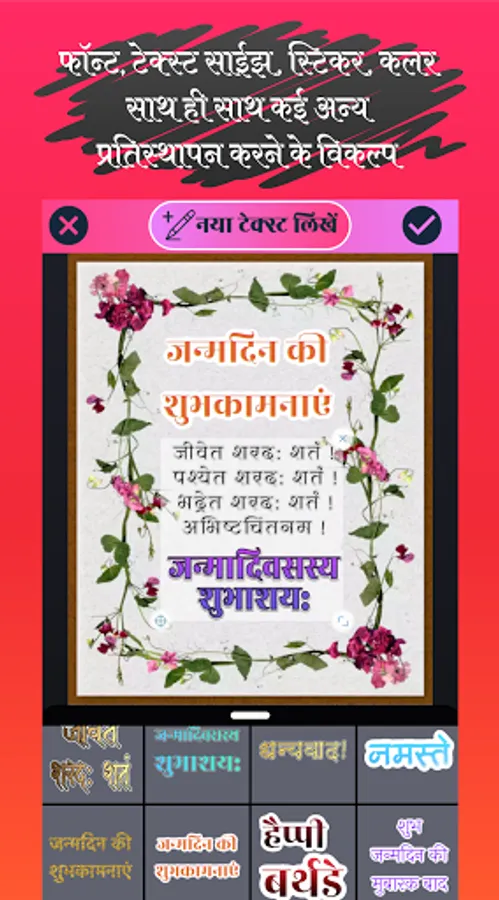 Create Birthday Card, Invitation Card, Greeting Card in Hindi language with the help of Hindi Greeting Card Maker application. Hindi Greeting Card Maker app provides you with many unique Devanagari font styles to make your birthday card, invitation card, greeting card and share it with your friends and family members on different social media platforms like Instagram, Facebook, WhatsApp, Twitter and many more.