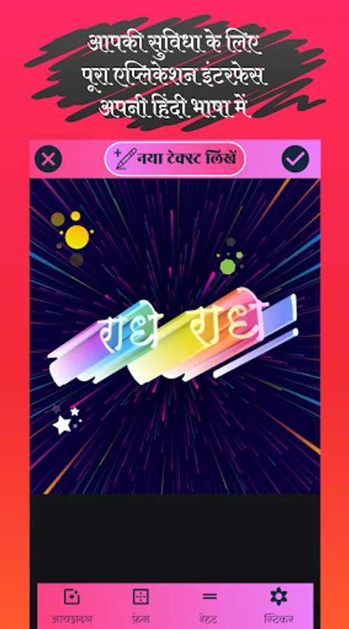 Hindi Greeting Card Maker provides with lots of background images, stickers, borders, lines, and textart stickers. Choose them as per the occasion and create an awesome greeting card and wish your loved ones in a unique manner.
