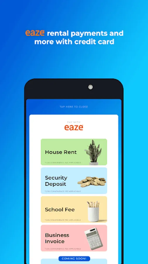 Ever got into a Cash Crunch? Month-end short of Cash Issues? But the due payments have to be done? Here comes the super app Eaze to your rescue. In Eaze we enable you to use your credit card to pay anyone (be it your landlord, your kid's school fee), anytime, anywhere (we charge only 2.99% of the transaction amount + GST). Our system then automatically credits the beneficiary(it may take up to 2 days for the amount to reflect in the beneficiary's account) and you get 45/50 days to pay your credit card bill.