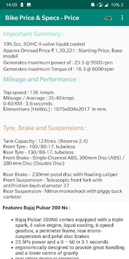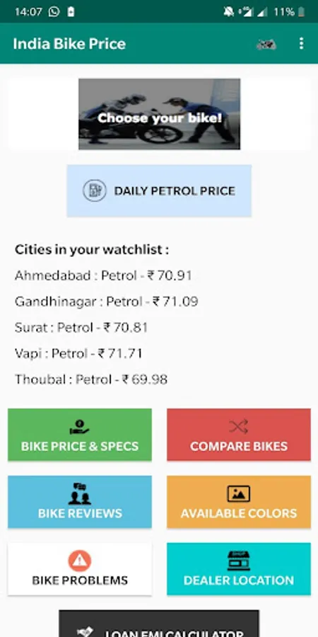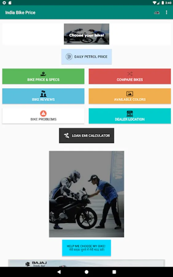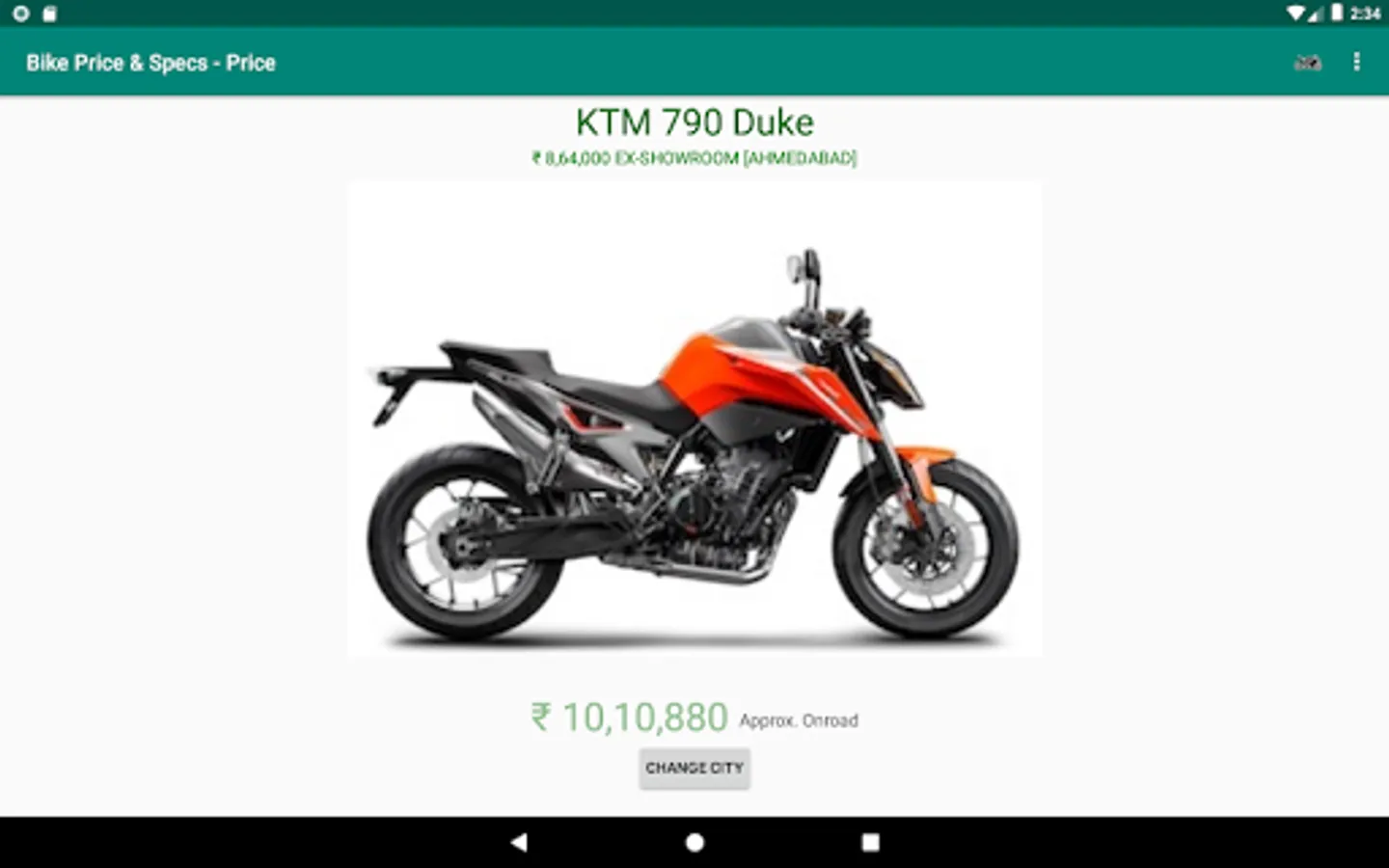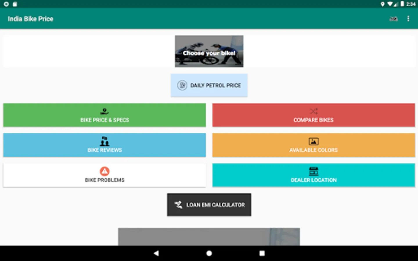 compare prices of india App. Lists Indian bike price, specification, mileage, average, top speed, 0-60, acceleration, available colors, dealer location, agency contact numbers, reviews, ownership, problems, pros and cons. We have also added Loan and EMI calculator for down payment and interest rate / amount.