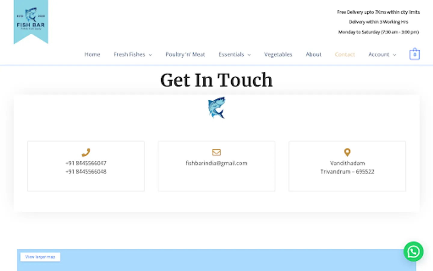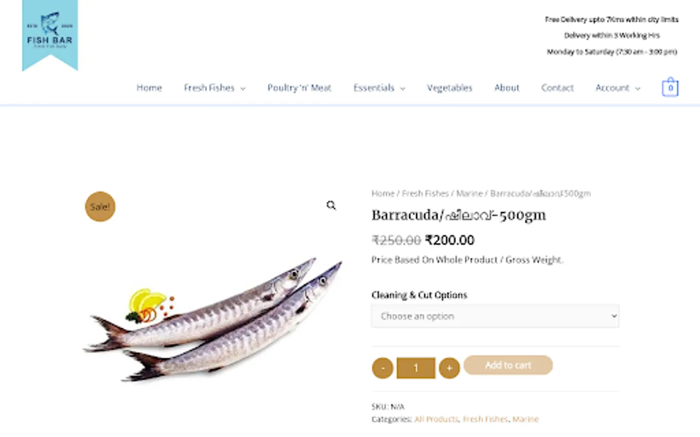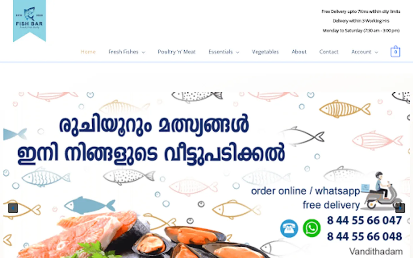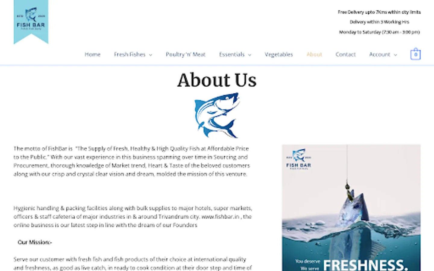 Hygienic handling & packing facilities along with bulk supplies to major hotels, super markets, officers & staff cafeteria of major industries in & around Trivandrum city. www.fishbar.in , the online business is our latest step in line with the dream of our Founders