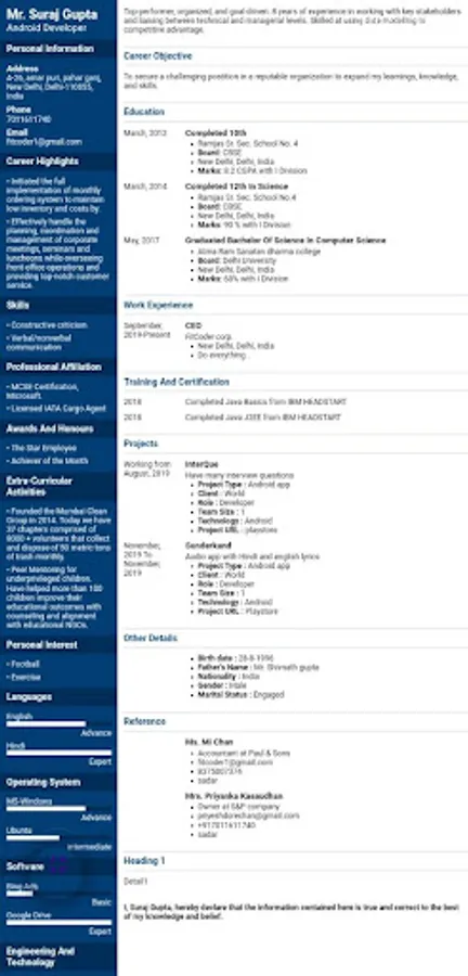Anyone who know to use android mobile phone can create Resume for free in PDF format. Fill the information, education, experience, skills and photo for creating Resume.