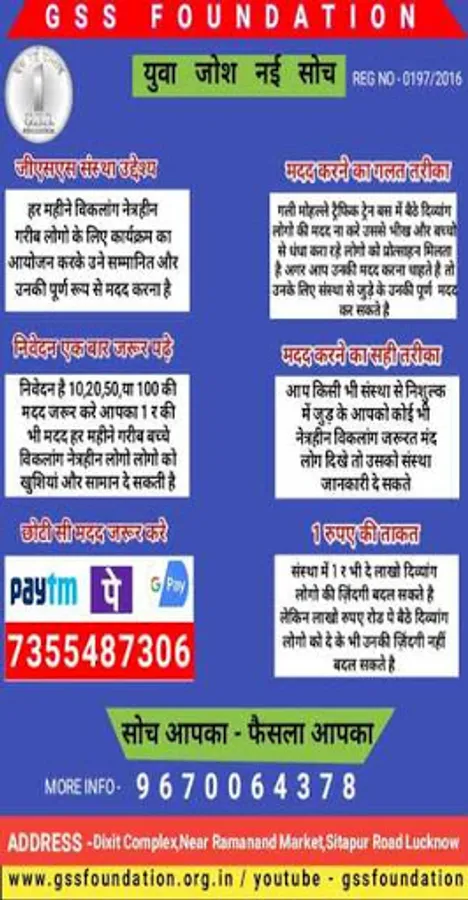 Pura jarur pade - Dosto agar ap chahte ho ki ap apni aur Sabi netrahin viklang bacho ki madadd karana to aaj hi ap gssfoundation aap ko download kare aur apne ghar k tv aur apna mobil recharge gss foundation aap se kare is app se recharge karne se Sabi bacho ko nisulk me kapde jute aur khane pine ka rashan pani free me mil jayga bas jarurt hai to apko gss foundation aap se recharge karne ki