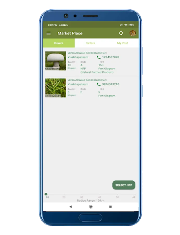 Market Place: This will help you to buy or sell the natural farmed products. Everyone can buy or sell their goods for better prices. You would be able to see all the market places with in 50 kms range by adjusting radius.