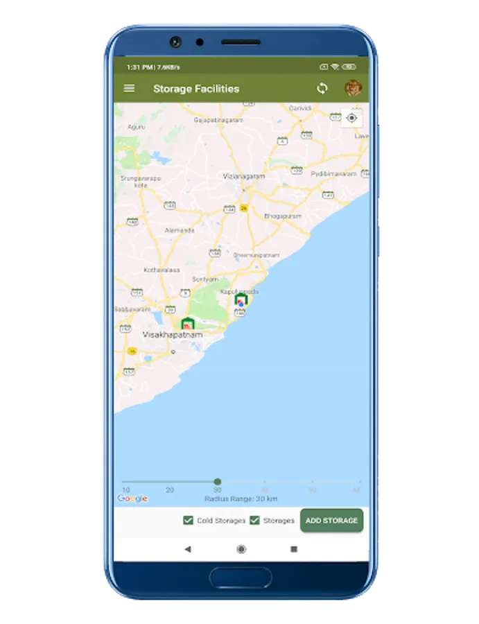 Storage: This will give you the information of the storages with in 50kms range. It gives you complete details like capacity in tones, is it available or not and differentiates cold storages, natural farmed product storages and storages.