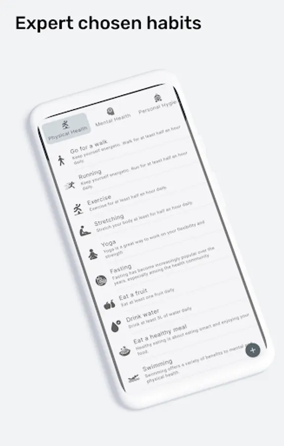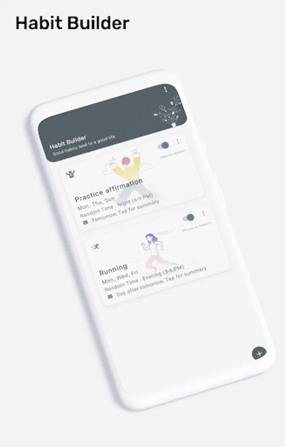 We have introduced a lot of habits with research which might help you. You can add habits of your own choice as well. The design is simple and intuitive to nudge you to build good habits. You can add motivation message and an image.