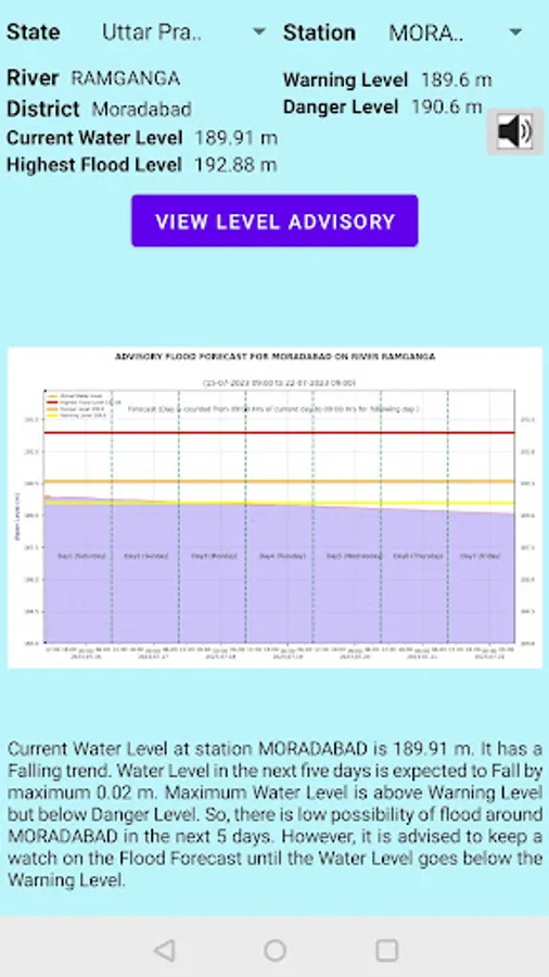 • Forecast Graphs and Analysis: The app provides explicit flood forecast graphs, along with audio and readable flood summaries for specific locations. User can easily navigate the map to assess flood forecasts in any area.
