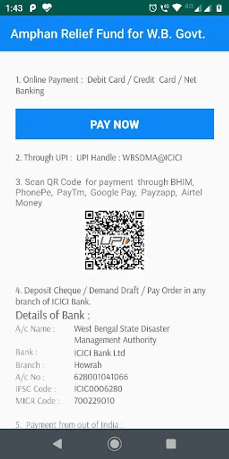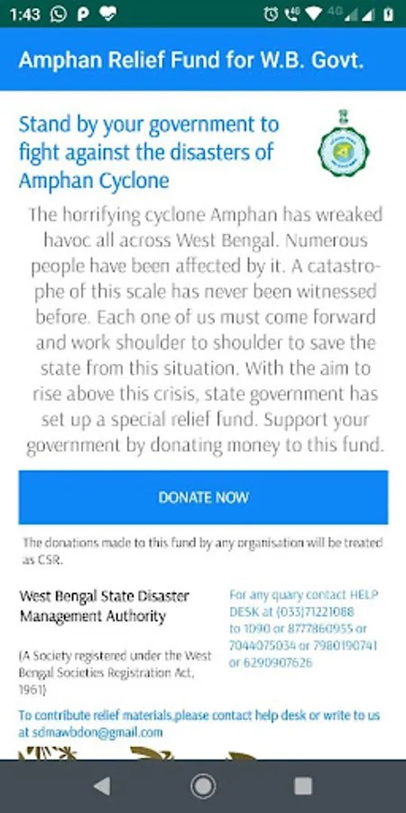 The horrifying cyclone Amphan has wreaked havoc all across West Bengal. Numerous people have been affected by it. A catastrophe of this scale has never been witnessed before. Each one of us must come forward and work shoulder to shoulder to save the state from this situation. With the aim to rise above this crisis, state government has set up a special relief fund. Support your government by donating money to this fund.
