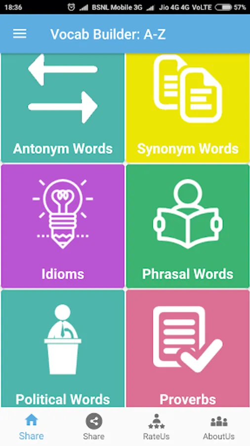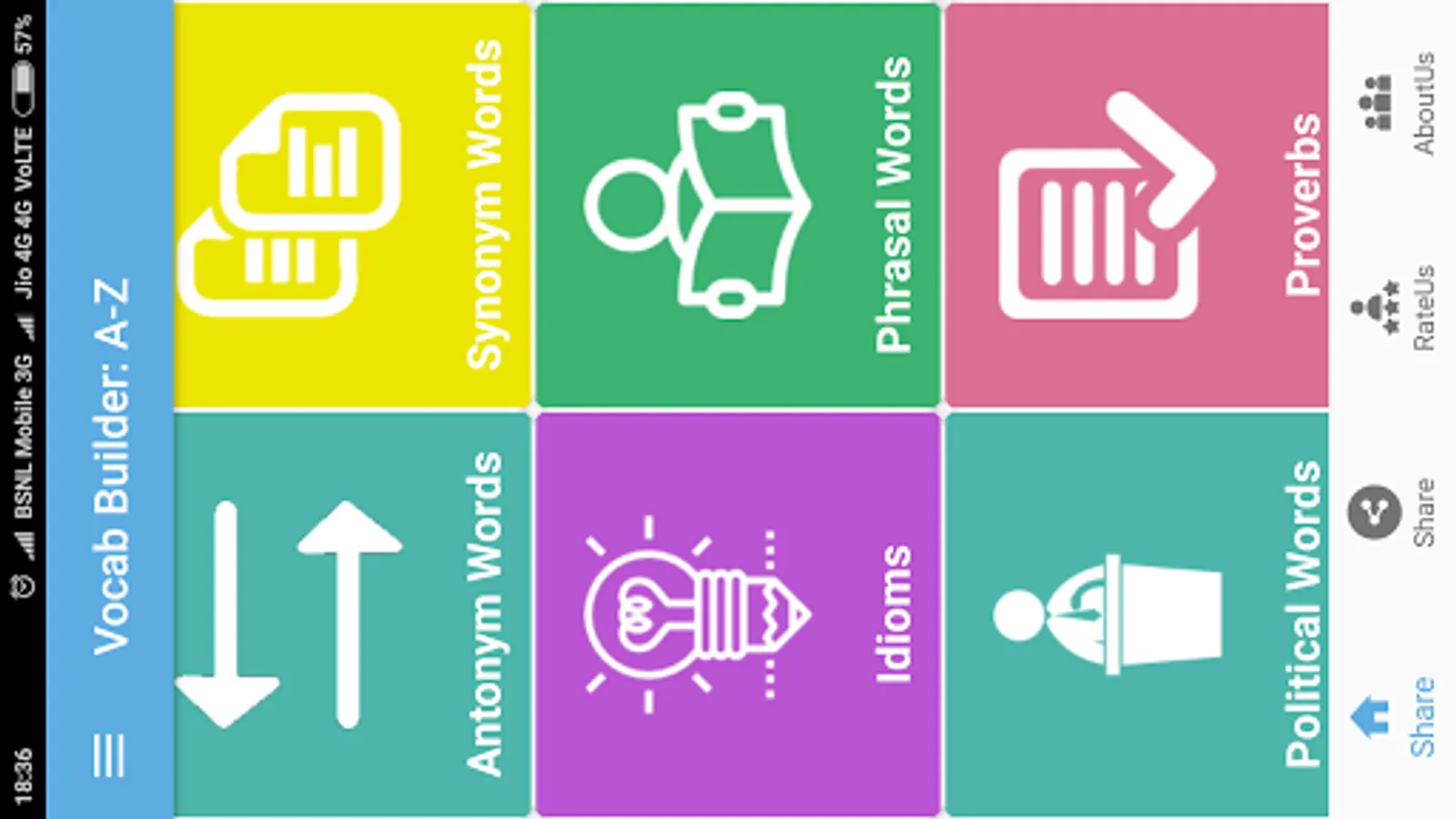 A-Z Vocab Builder- Learn Nouns, Adjectives, Verbs, Synonyms-Antonyms, Phrasal verbs, Proverbs, Foreign language words & Political words in English language words through most elegantly designed note sheets.