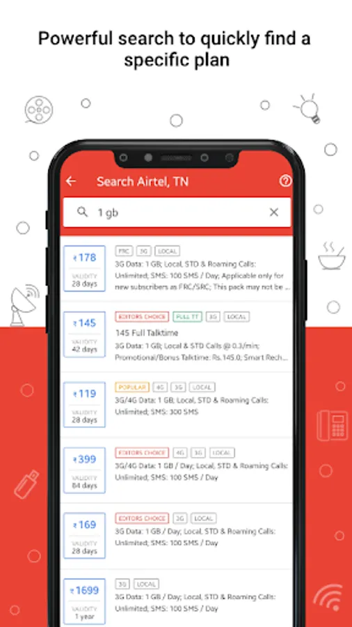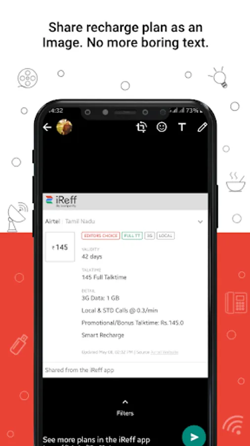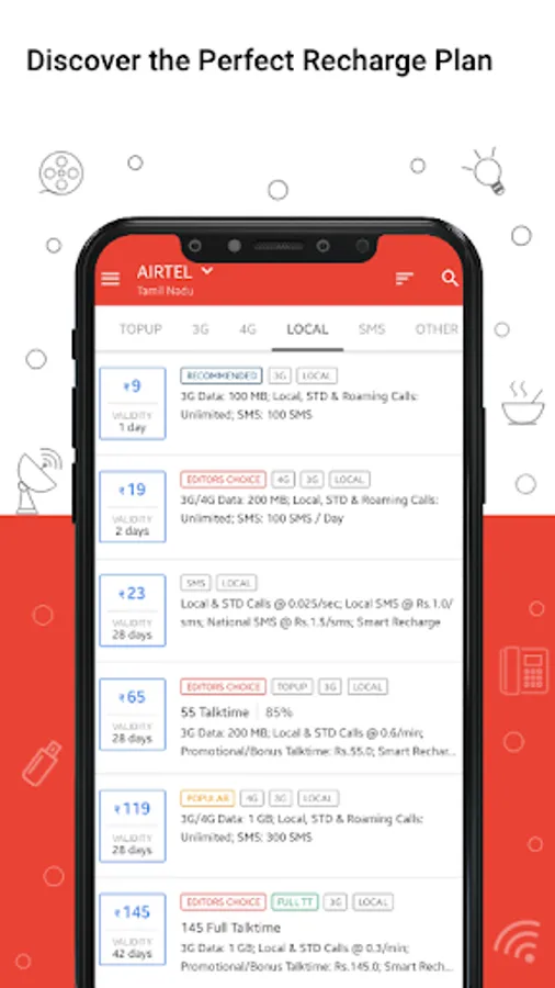 Before you recharge your prepaid mobile, find the best recharge plan/pack for your exact need. iReff app is the fastest and easiest way to find the recharge plan you need and buy it through our online recharge partners. Browse through the common benefit categories - Topup, SMS, Data (4G/3G/2G), Local, STD, ISD. Or try the powerful full-text search feature to find recharge plans matching your specific need or for price/plan comparison.
