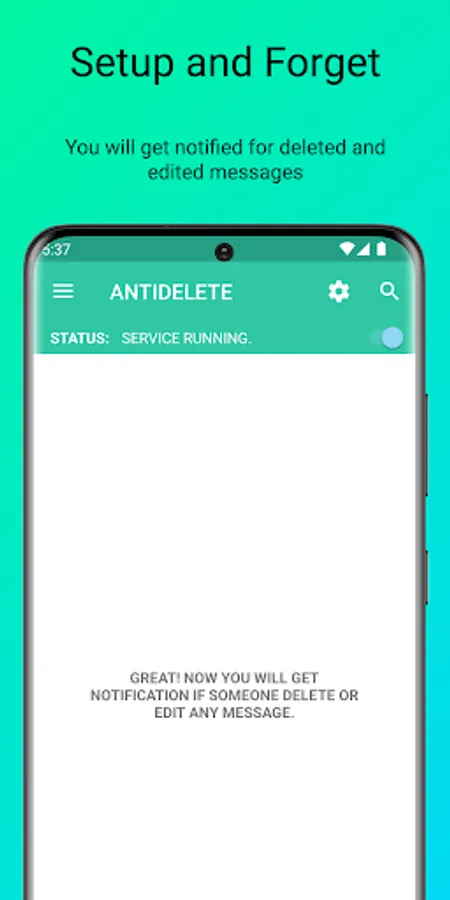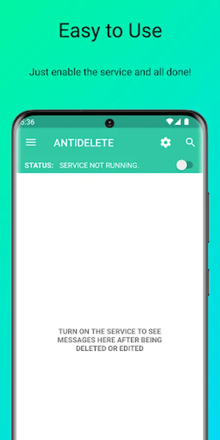 1. Open the Antidelete app and start the service by clicking on the toggle on the top right.