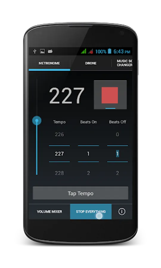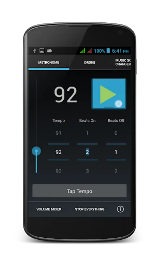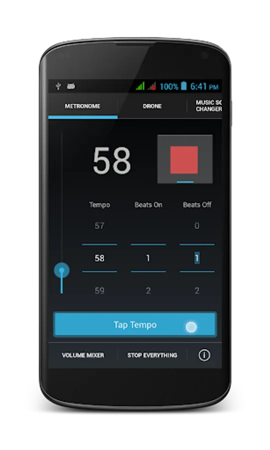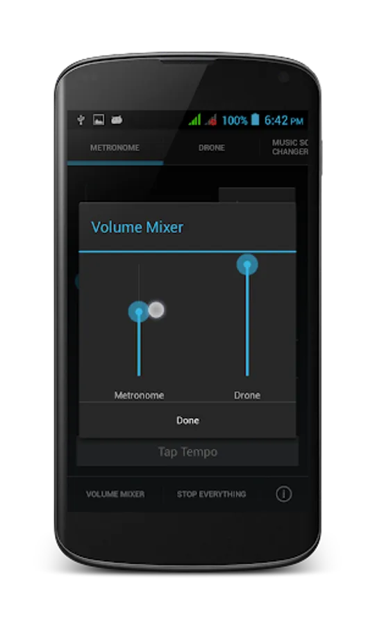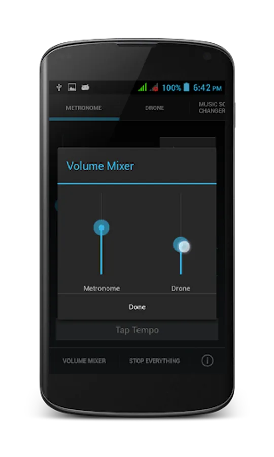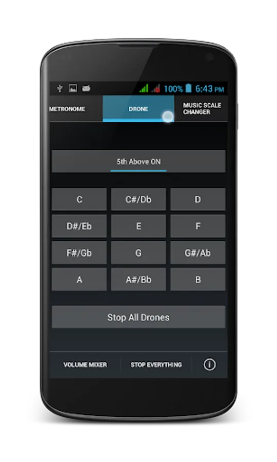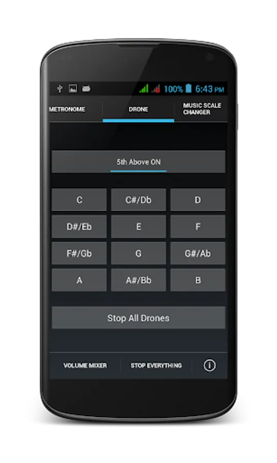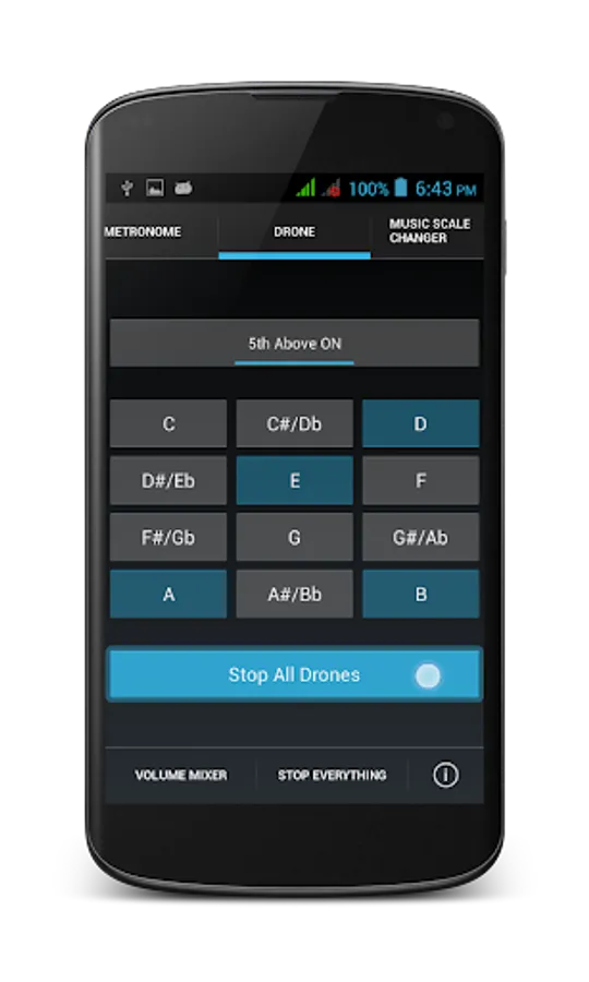 Contains a Tuner, Pitch Drone, Advanced Metronome which allows users to improve their internal time-keeping by alternating specified periods of clicks and silence.
