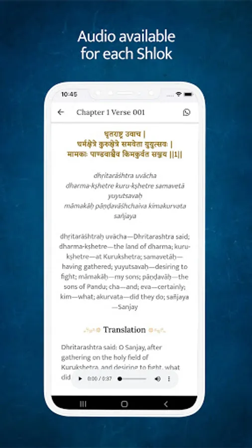 4. Audio available for each shloka. Each verse has been provided with the audio for the correct pronunciation of the verse.