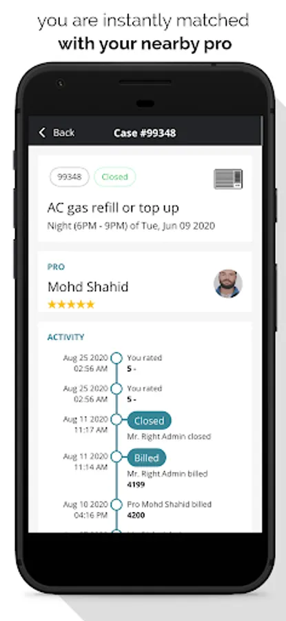 • Once the case is booked, our app instantly finds a verified and reliable home service professional (Pro) in your locality