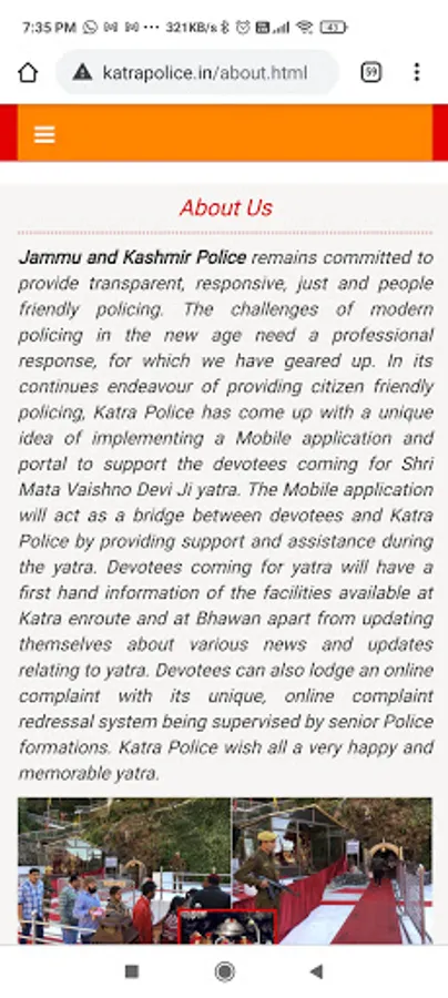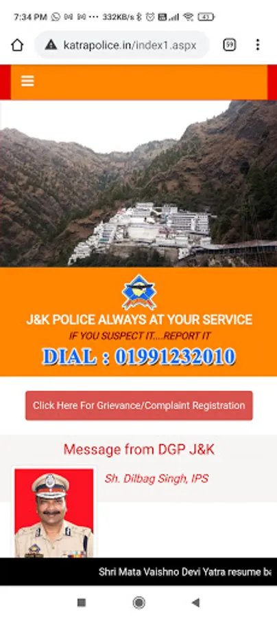 Jammu and Kashmir Police remains committed to provide transparent, responsive, just and people friendly policing. The challenges of modern policing in the new age need a professional response, for which we have geared up. In its continues endeavour of providing citizen friendly policing, Katra Police has come up with a unique idea of implementing a Mobile application and portal to support the devotees coming for Shri Mata Vaishno Devi Ji yatra. The Mobile application will act as a bridge between devotees and Katra Police by providing support and assistance during the yatra. Devotees coming for yatra will have a first hand information of the facilities available at Katra enroute and at Bhawan apart from updating themselves about various news and updates relating to yatra. Devotees can also lodge an online complaint with its unique, online complaint redressal system being supervised by senior Police formations. Katra Police wish all a very happy and memorable yatra.