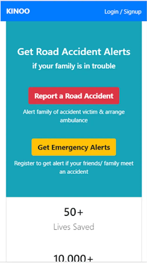 KINOO is a road accident reporting app, which empowers users to receive/send accident alerts and also arrange nearest ambulance based on availability.