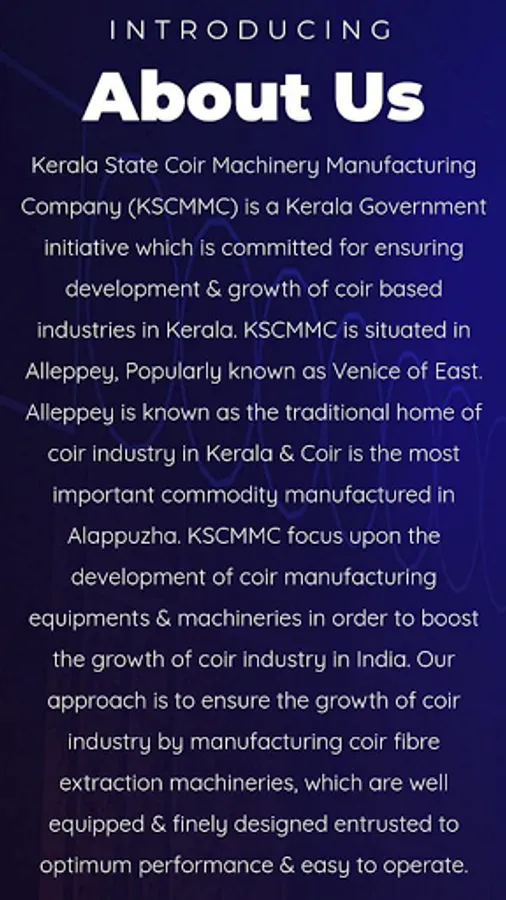 Kerala State Coir Machine Manufacturing Company (KSCMMC) is a Kerala Government initiative which is committed for ensuring development & growth of coir based industries in Kerala by building new machineries and maximize the output with the help of innovative technology. KSCMMC is situated in Alappuzha, which is considered as the cradle of coir and carpet industries in Kerala.