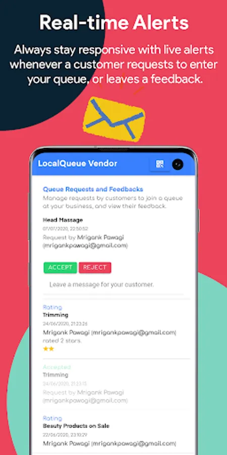 - Real time updates to keep you informed of customer requests to enter your queue.