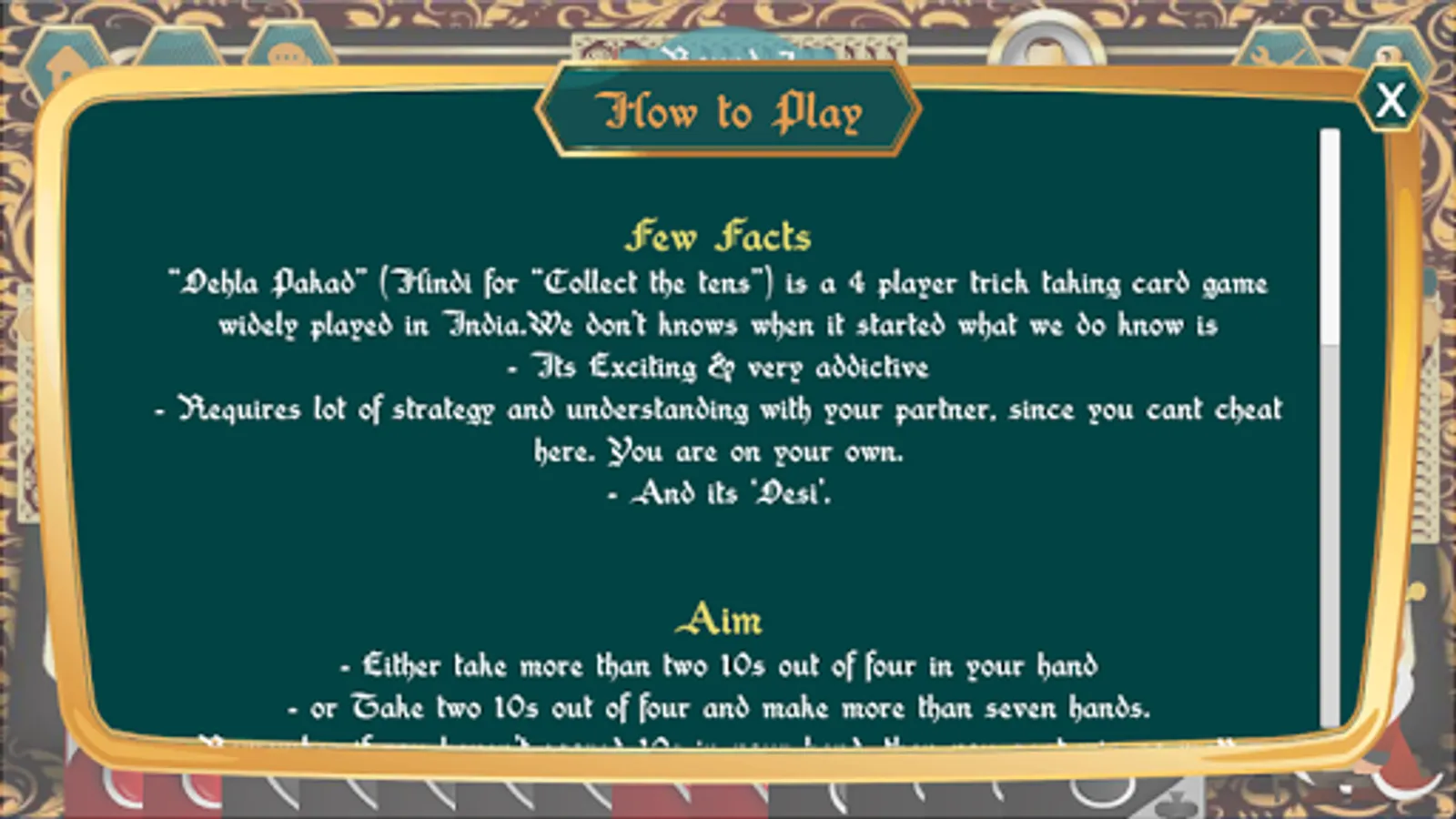 Let’s join the LARGEST Dehla Pakad (Hindi: देहला पकड़ ) & Call Break (Hindi: कॉल ब्रेक ), Hokm ( Persian: حکم ), Tarneeb (arabic: طرنيب ) & Spades (America) COMMUNITY in the world to play online! You can play offline too.