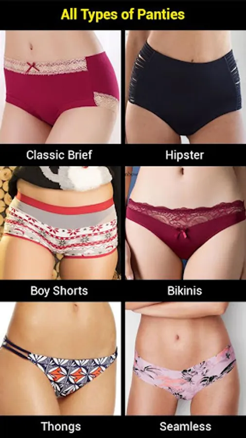 Boy Shorts, Classic Briefs, French Cut Panties, Hipsters, Thongs, G-String, C-String, Control Briefs, Tanga, Brazilian Brief, Tap Pants, Seamless Panties, Bikini, Butt Lifter, Adhesive Panty, Open Crotch Panty, String Bikini, High Waist Brief, Garter Panty, Maternity Panty, V Kini, Caged Bikini, Cheekster, Butt Booster.