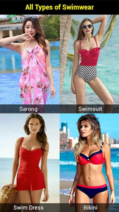 Types of Swimsuit: One Piece Swimsuit, Bikini, Skirtini, Tankini Set, Swim Dress, LegSuit, Sling Swimsuit, Ruffle Swimsuit, Bandeau Swimsuit, Top-Bottom Set, Three-Piece Swimsuit, Burkini.