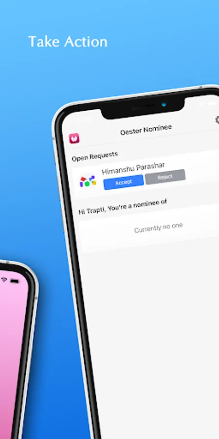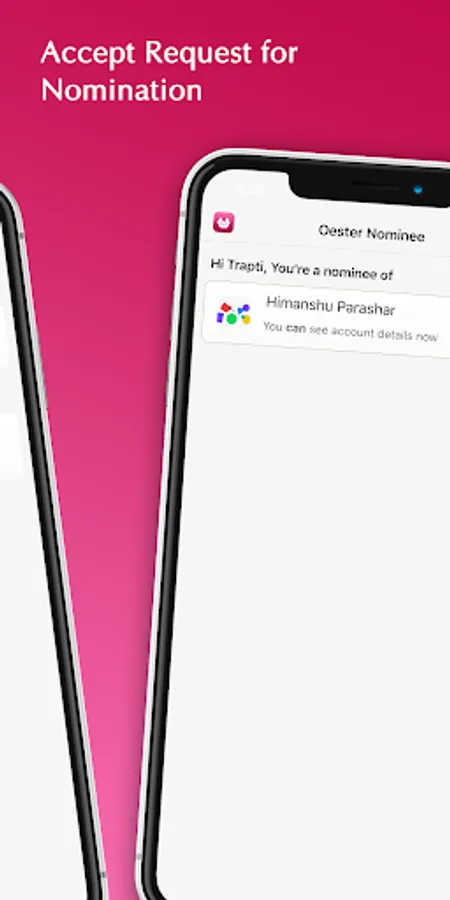 Nominee app works with Oester app. Someone using Oester app can nominate one's love one as a nominee. When this happens, the nominee can download the Nominee app and have option to view the account details of their nominator.