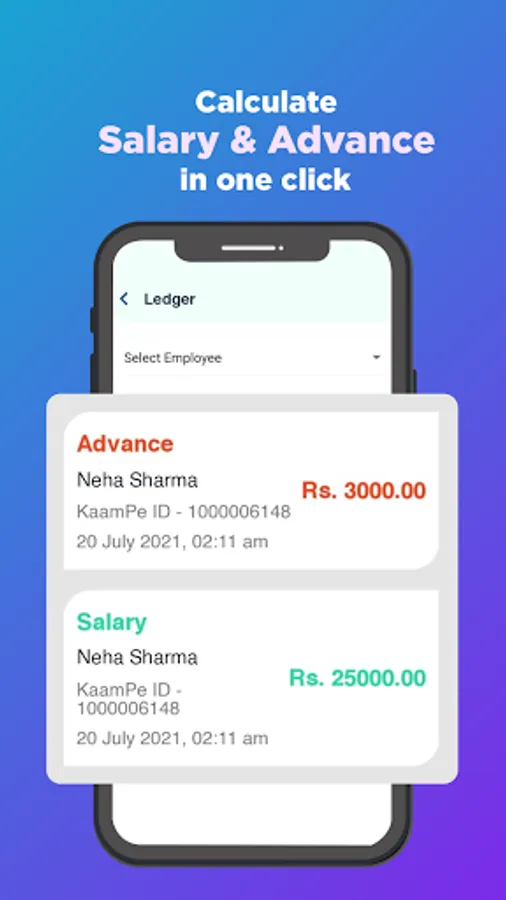 KaamPe enables Employers to manage Staff Advance, Salary,Overtime and much more based on their Attendance using the auto calculator in the app.