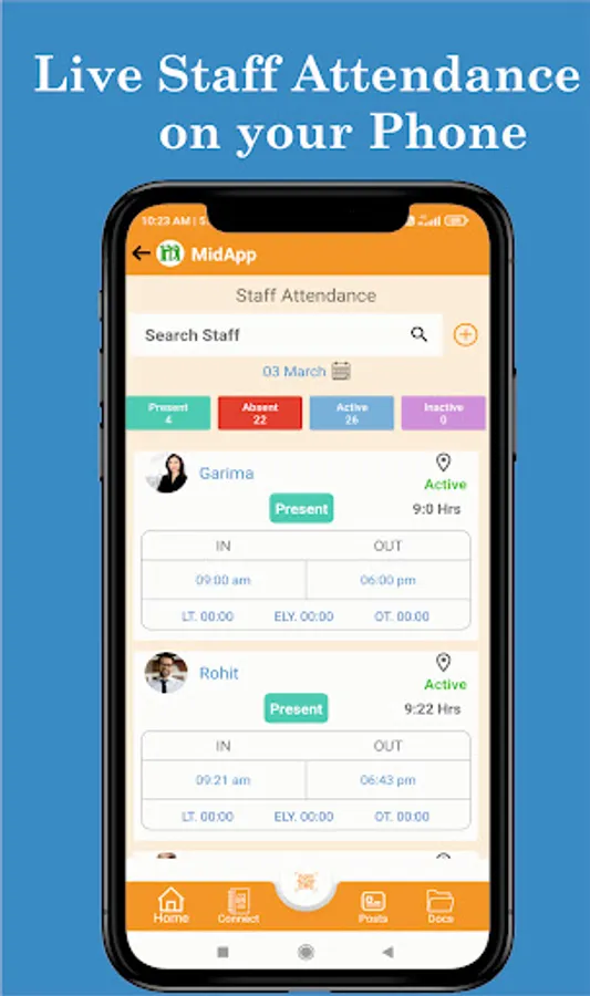 MidApp is best mobile App for staff attendance without using any hardware. Users can mark attendance from their phone by scanning QR Code, or by GPS location or by selfie. Face verification & QR card Attendance is also for team attendance.