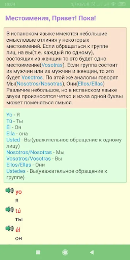 Application for learning Spanish, the application contains more than 200 exercises for memorizing the Spanish language. Dictionary of Spanish words, the ability to add your own words. The rules of the Spanish language starting with the basics, the alphabet. Various Spanish test cases will help you quickly learn the structure of Spanish and apply the rules of the Spanish language without hesitation.