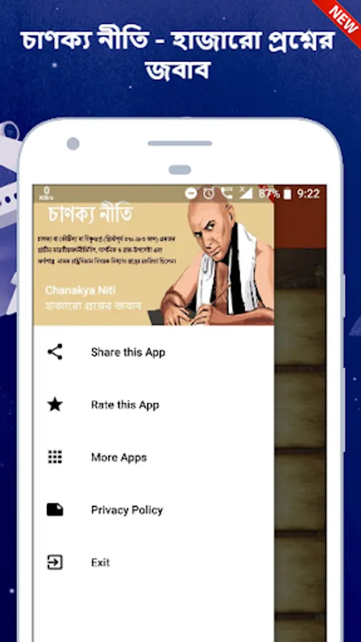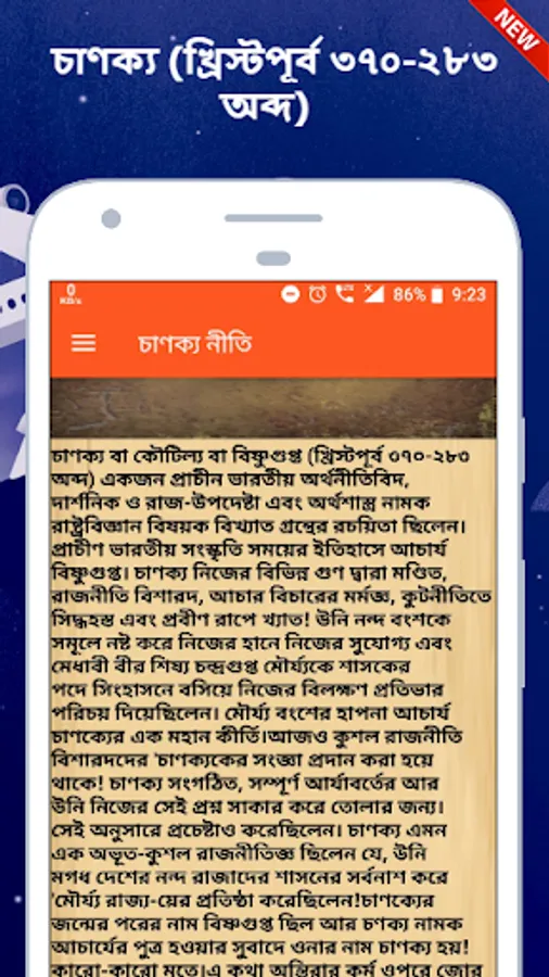Chanakya Niti Bengali App চাণক্য নীতি বাংলা চাণক্য ছিলেন আমাদের ভারত উপমহাদেশের একজন নামকরা অর্থনীতি, রাজনীতি, সমাজনীতি ও কূটনীতির শিক্ষক। অপরদিকে তিনি ছিলেন মৌর্য রাজের প্রধানমন্ত্রীও। আজ থেকে প্রায় তেইশ শত বছর আগে উনি তার শিক্ষাদান ও কর্মকাণ্ড চালিয়ে গেছেন এই ভূমিতে। নিজে প্রধানমন্ত্রী হয়েও বসবাস করতেন শ্মশানে; দেশীয় রাজদের বিদেশীদের হাত থেকে নিজ ভূমি উদ্ধারে উৎসাহ দিতেন, নিজে সামনে থেকে লড়তেন।