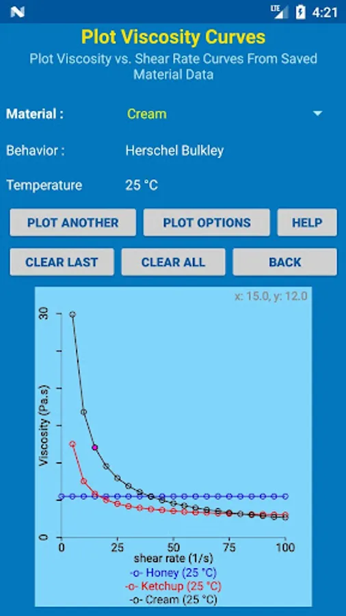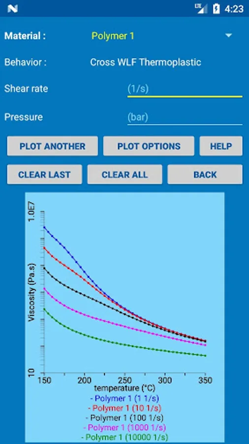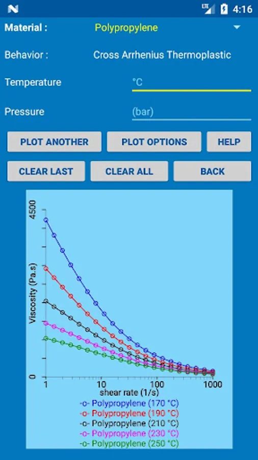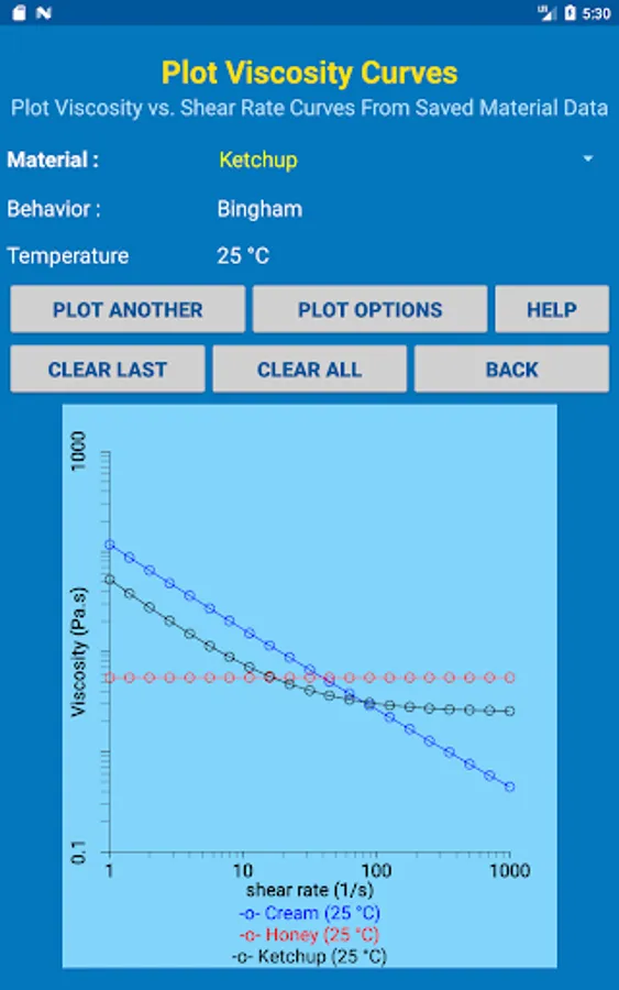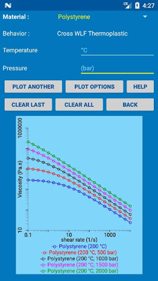 Calculate viscosity at different shear rate, temperature and pressure conditions using the saved material data.