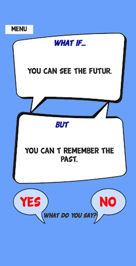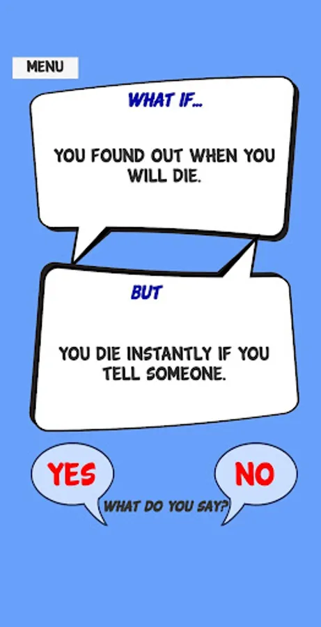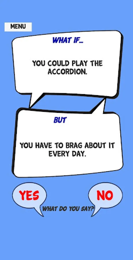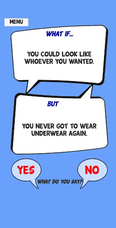 These questions can be as serious or as silly as you want them to be. In our games, they usually end up both ridiculously silly and about people in the room, like “What if Joe wore only corduroy clothing all the time?” At any rate, don’t be afraid to let your creativity show!