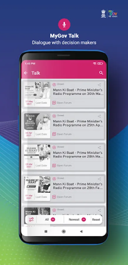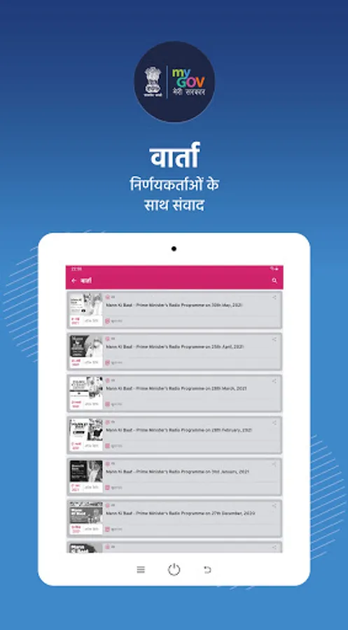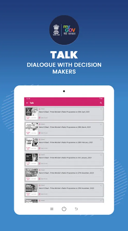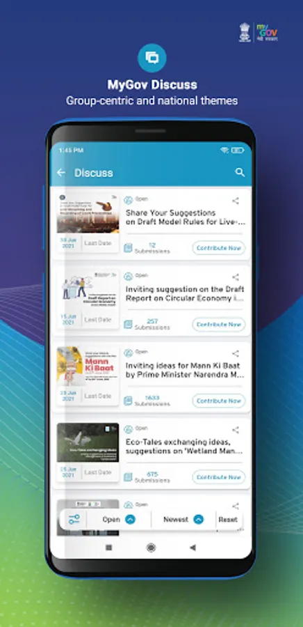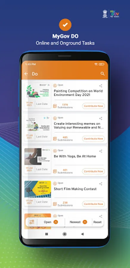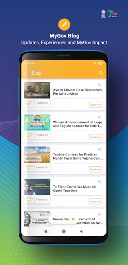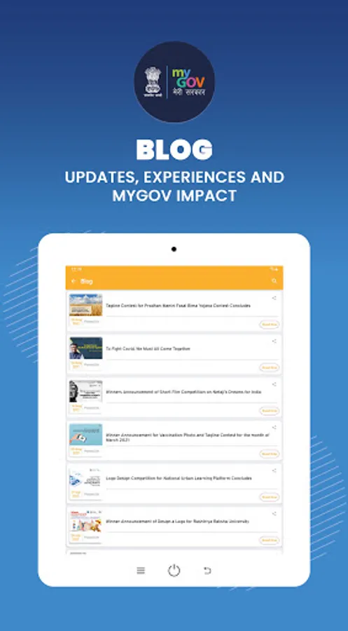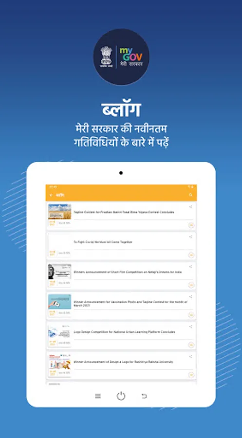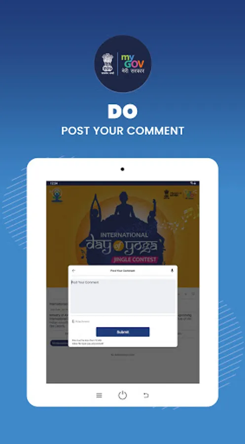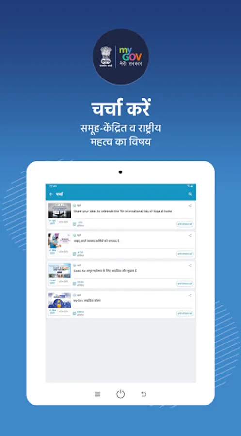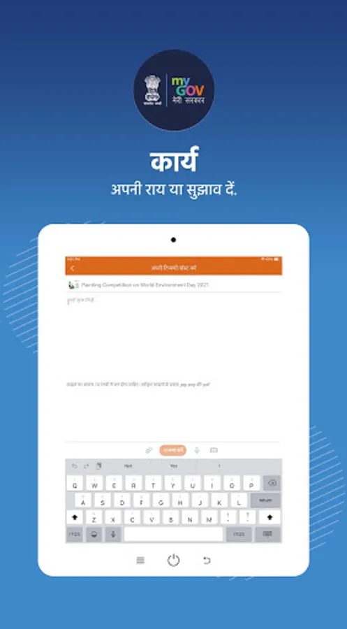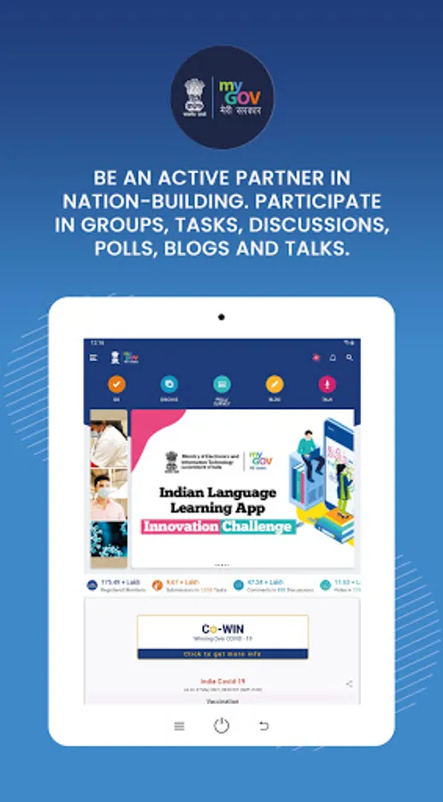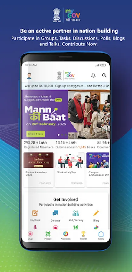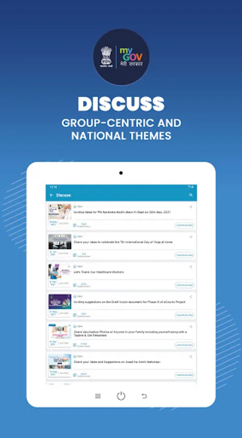 MyGov is Government of India’s innovative citizen engagement platform for direct citizen participation in governance by providing an avenue for channelizing their ideas, comments and creative suggestions to Central Ministries and associated organizations. Citizens can participate in policy formulation and program implementation to usher in an era of direct participatory democracy.