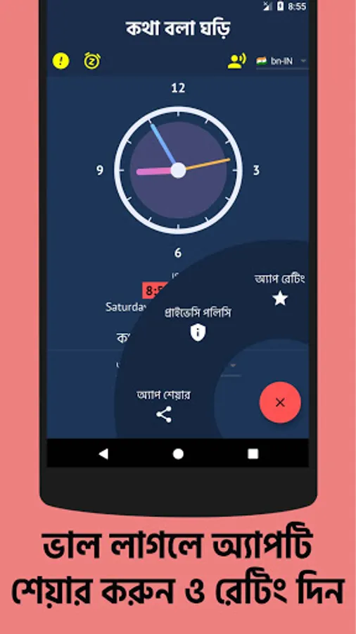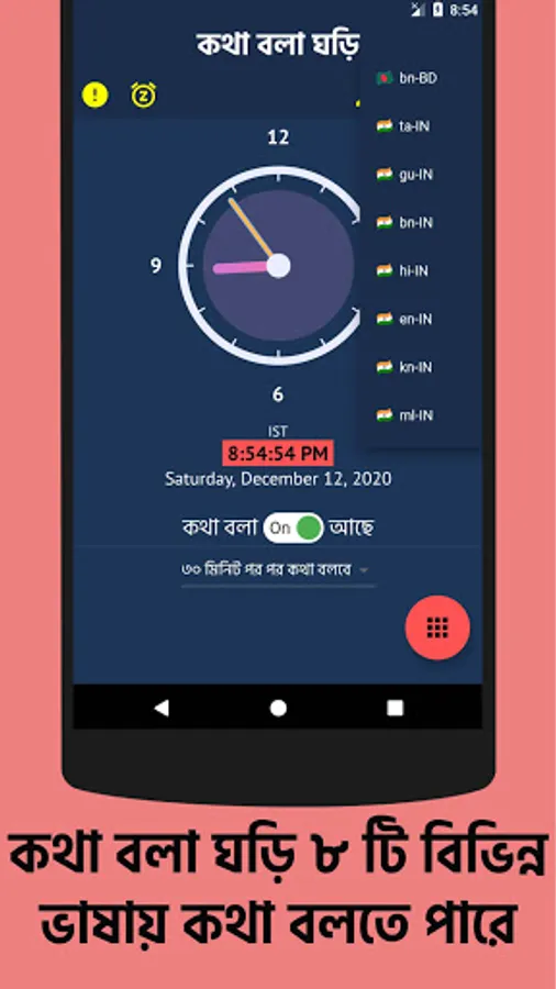 ** Talking Clock / Talking Clock or Talking / Speaking Clock supports 8 languages including Bengali and English.