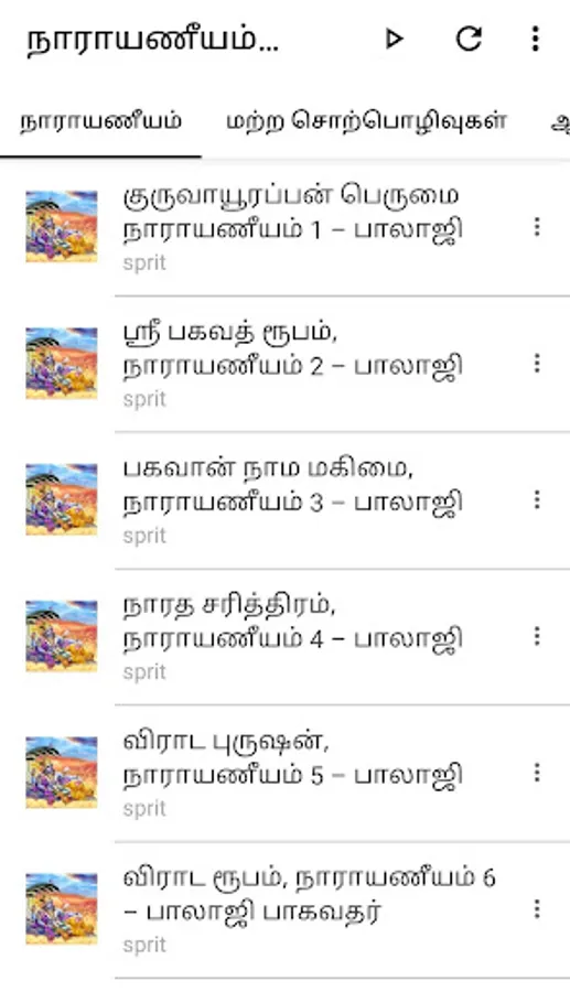 Nārāyanīyam is the story of Lord Narayana. It is a work consisting of 1035 slokas or verses, divided into 100 dasakams or chapters, each dasakam consisting of approximately 10 slokas. It is a condensed version of Bhagavata Purana, which consists of 18,000 slokas authored by Veda Vyasa. It is said that the work has the blessings of Lord Krishna or Guruvayoorappan, the presiding Deity of Guruvayur.