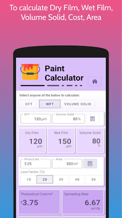 To calculate Dry Film Thickness, Wet Film Thickness, Solid by Volume, Consumption Rate & Cost.