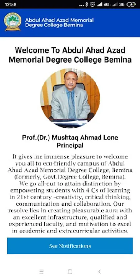 Foundation stone laid in the year 1970 by KH.G.M.sadiq(then cheif minister of J&K)government degree college bemina started academic operations in the year 1972. the college has the largest campus in the state spread over a land area of 300 + kanals ,which accommodates various blocks housing Bio-science, physical sciences , commerce and business studies ,U-shaped structure for lecture theatres,general administration and hostel besides ,srinagar city , the college caters to the educational requirements of the student comming from far -off and frontier areas of the state like gurez ,tangdar, kargil .