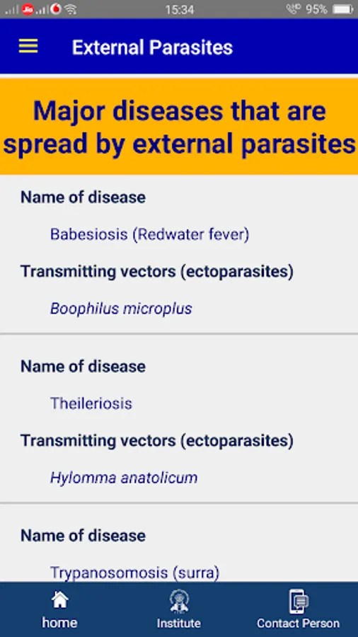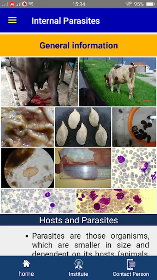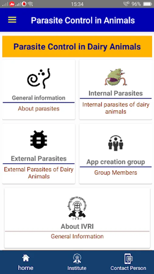 The Mobile App “Parasite Control in Dairy Animals” has been developed in “English language” by the team of Scientists/ Subject Matter Specialist of Indian Veterinary Research Institute- Izatnagar. This App will provide basic knowledge and create awareness on the various aspects of parasitic diseases infecting/infesting large ruminants in India. Target groups of this “Mobile App” are different stakeholder’s viz. livestock owners, progressive farmers and dairy entrepreneurs, besides graduating veterinary students and field veterinary officers for whom it will be a ready reckoner in diagnosis, treatment and control of parasitic diseases. Aspects covered in the App includes a brief account on both internal and external parasites, their broad types, life cycle requirement, source of infection to the animals, course of disease per se, major symptoms, diagnosis, treatment and control along with very specific comments, if any for the particular drug. The original pictures incorporated for specific diseases will be proved beneficial to the Veterinary Officers colleagues, in correlating their observations recorded while working with an animal. Besides, a suitable deworming schedule has been also included in the App to suit animals of almost all agro-climatic zones of India. This application will work for android API version 15 to 27 i.e. it can work properly for Android Jelly Bean user to Android Oreo users.
