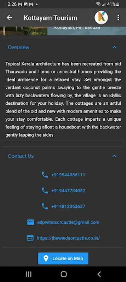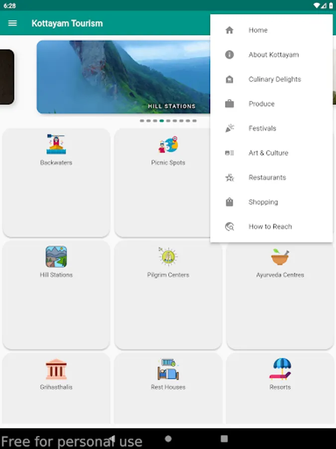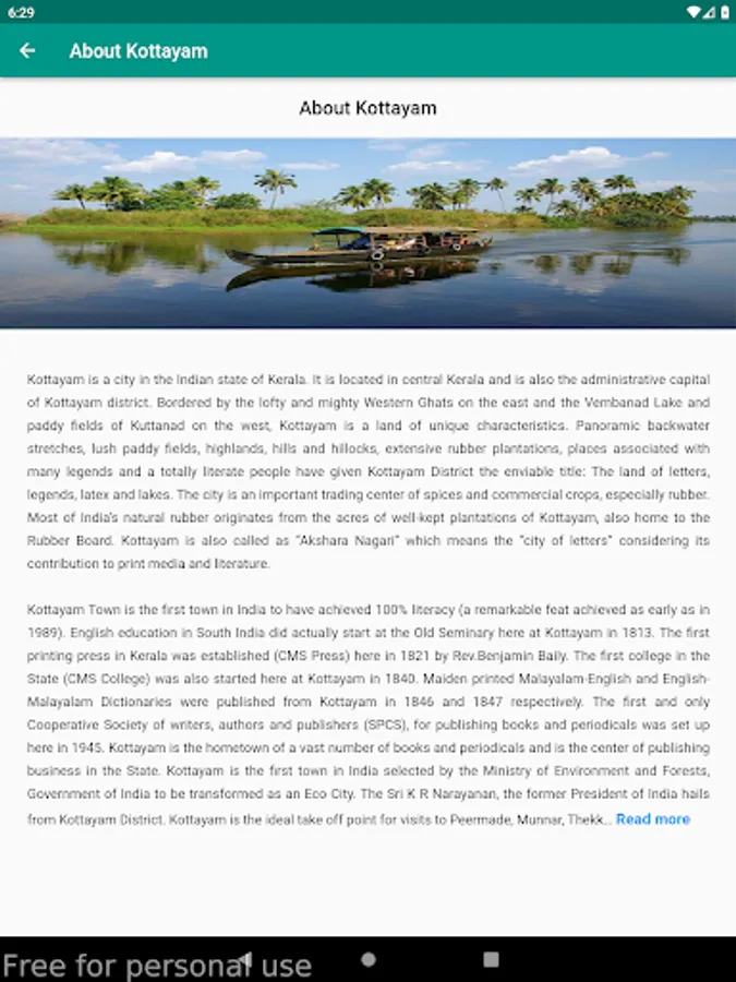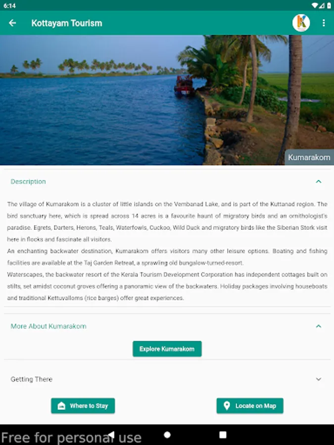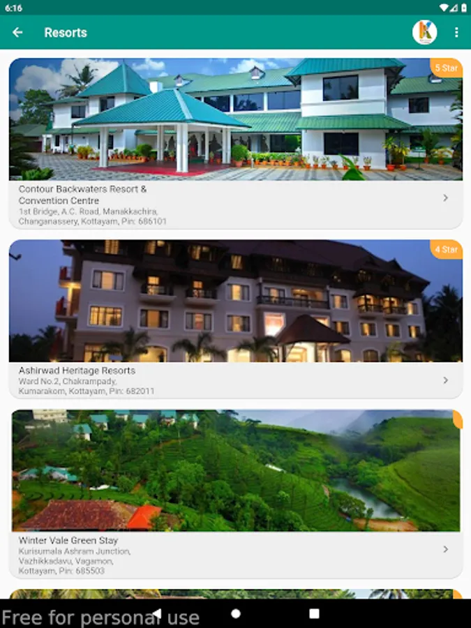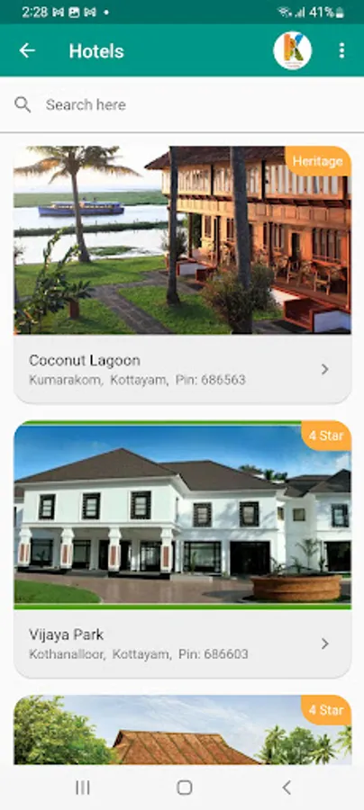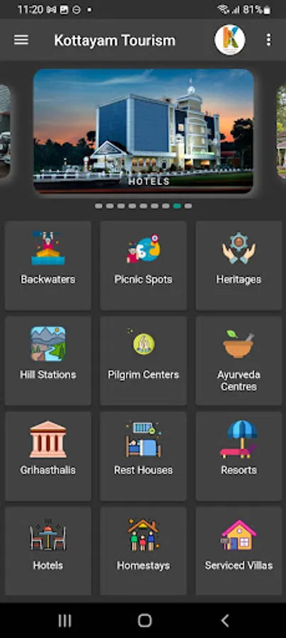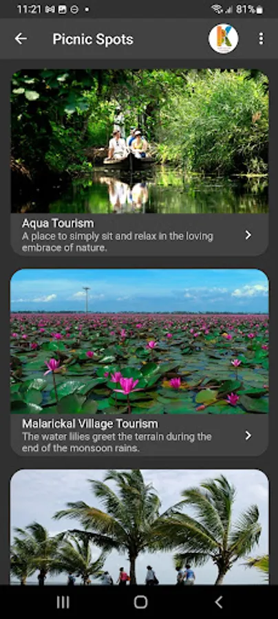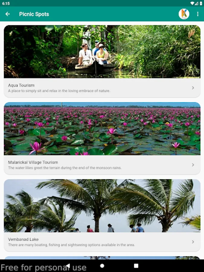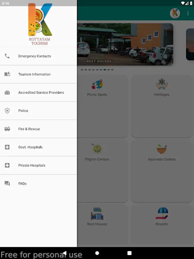This mobile application is a gateway to various tourism attractions in the district, namely, Backwaters, Picnic Spots, Heritages, Hill Stations, Pilgrim Centres & Ayurveda Centres. Various options for the stay include Rest houses, Resorts, Hotels, Homestays and Serviced villas. Tapping a category lead you to the various tourism destinations in the category and tapping a destination give you description and its location on google map. Also various stay options in and around the destination is also made available.