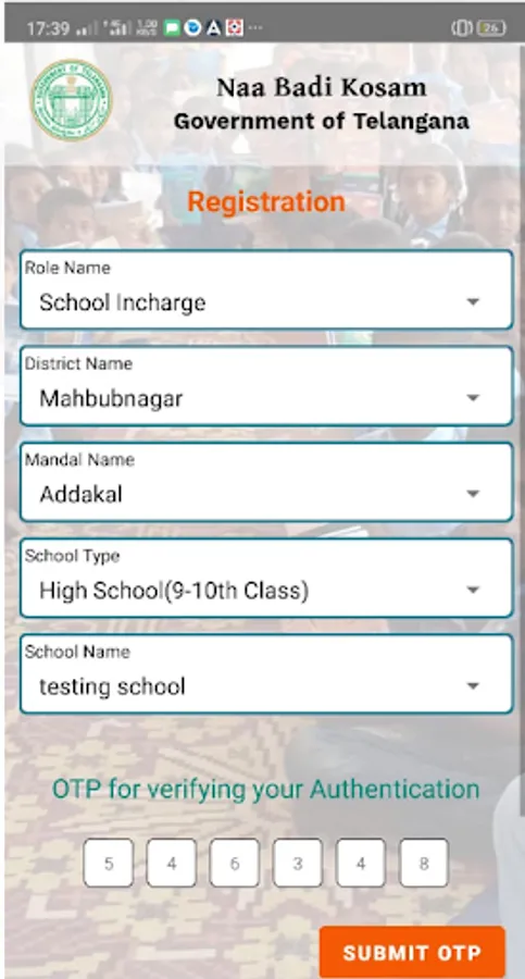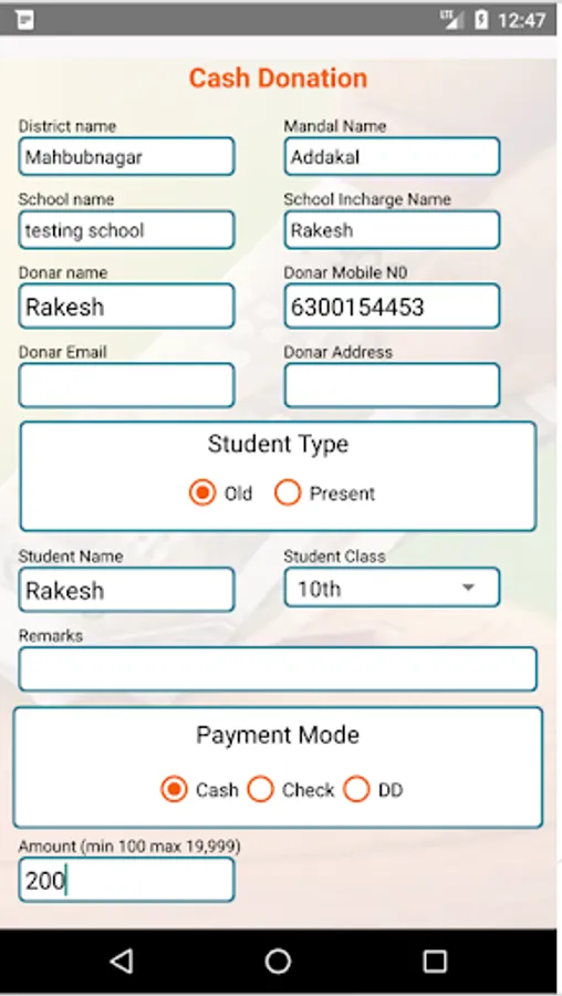 There are different user roles like district collector, district education officer (DEO), school in-charges in the mobile application. The application is integrated with Aadhaar for making donations after reading Aadhaar OTP from concerned mobiles to ensures user identity. The SMS gateway also integrated to generate auto SMSs to users. The cash module is brought into the functionality initially and necessary MIS reports like school-wise, district-wise are available. Shortly, the application is integrated with payment gateway.